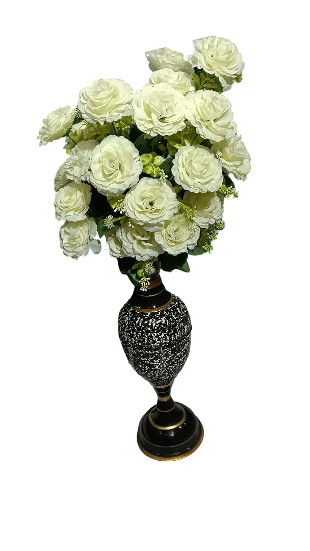 Elegant White Rose & Peony Artificial Flower Arrangement - Antique Black and Gold Decorative Vase Included